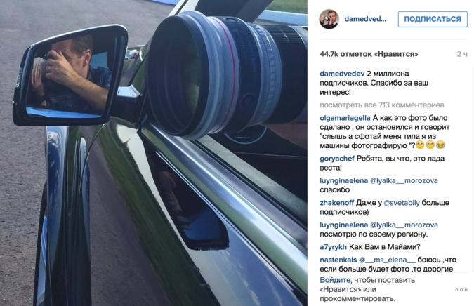 Премьер-министр Дмитрий Медведев сообщил о росте числа своих подписчиков в социальной сети Instagram до 2 миллионов.