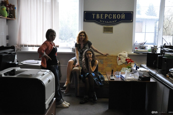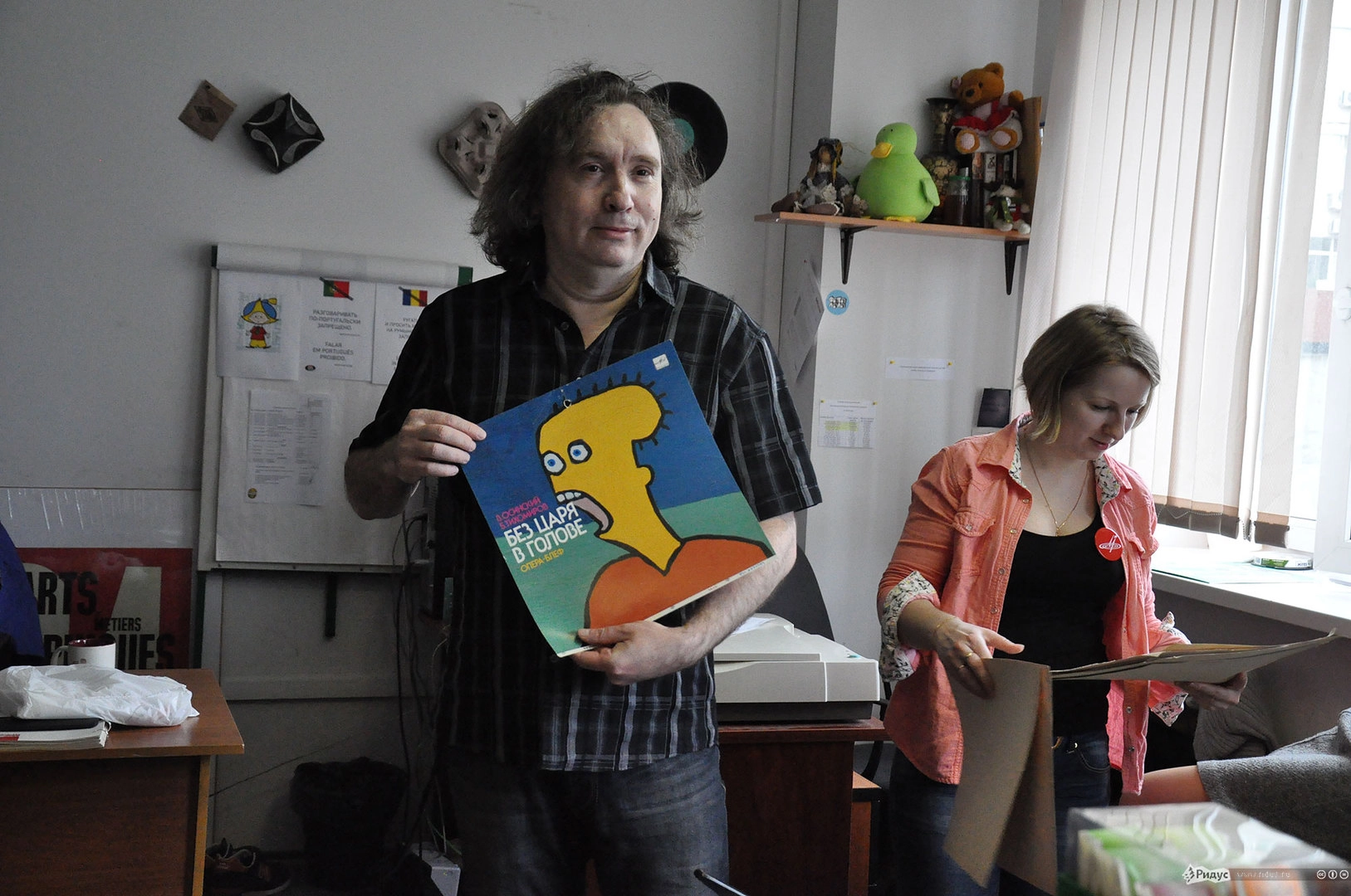 В комнате дизайнеров нас встречает мужчина верхом на комбике с гитарой в руках. Перебирая струны, он отмечает, что дизайнеров здесь нет: "Они - редактёры, мы - дизайнёры, вы - корреспондёры, все просто". Обстановка под стать его облику: неформальная, весёлая, шумная, но вполне себе рабочая. На столах валяются эскизы виниловых конвертов, причём не только современных, но и тех, которые выходили ещё в прошлом тысячелетии.