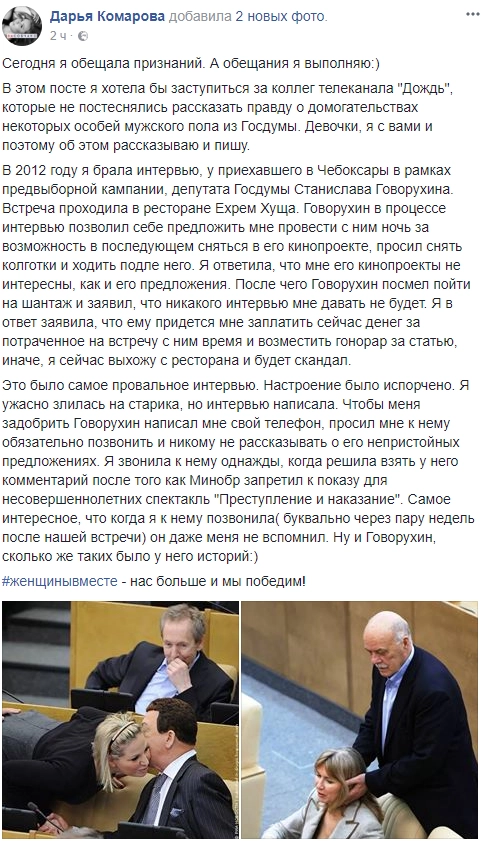Ранее журналистки Дарья Комарова написала пост в Facebook о домогательствах со стороны знаменитого актера и режиссера Станислава Говорухина. По ее словам, в 2012 году она встречалась с режиссёром в чебоксарском ресторане, чтобы взять интервью.