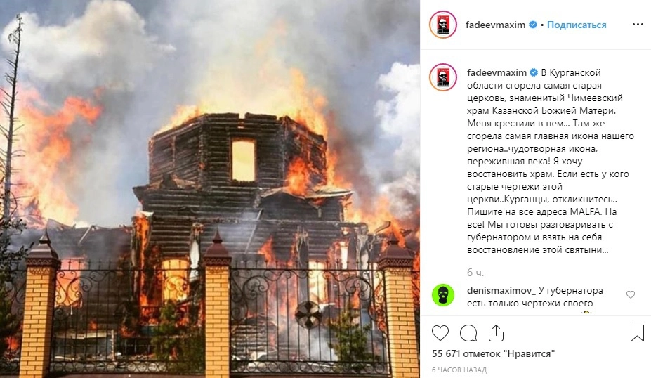 Продюсер Максим Фадеев намерен заняться восстановлением Свято-Казанского Чимеевского мужского монастыря в Курганской области, в котором 3 июля произошел пожар.