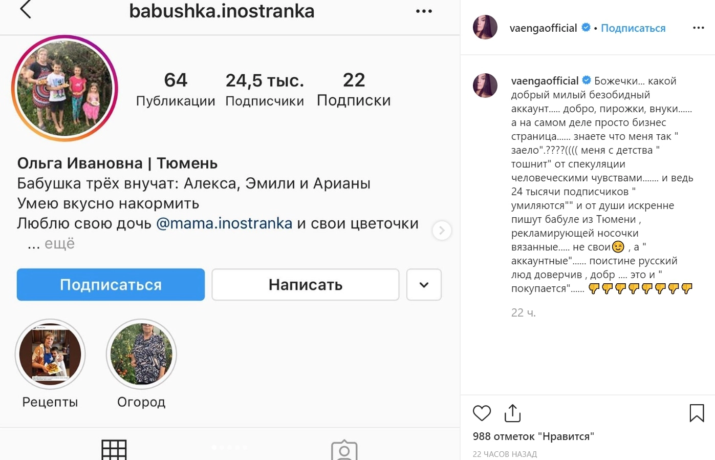 При этом в следующем посте Ваенга выложила скриншот со страницы известной YouTube-блогерши с почти 160 тысячами подписчиков, которая рассказывает об огороде и тоже делает рекламу, назвала ее «честнейшим тружеником», призвав подписываться на нее. А в адрес бабушки Ваенга оставила еще несколько критических комментариев.