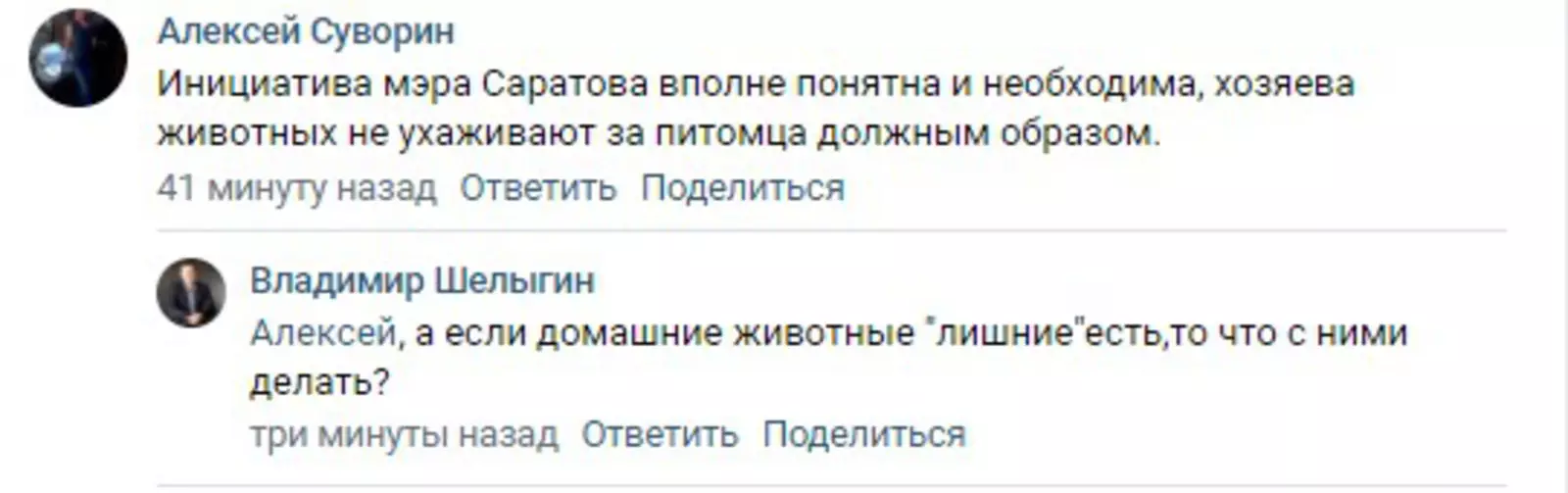 Наверное, в первоочередном порядке это должно коснуться собак, — сказал мэр Саратова в интервью радиостанции «Говорит Москва».Многих пользователей Рунета обеспокоила инициатива Исаева — опасения у них вызывает в основном судьба животных, которые будут признаны «лишними». Впрочем, у саратовского мэра нашлись и сторонники, рассчитывающие, что его план достигнет цели — перекрытия источников «поступления» собак и кошек на улицу.