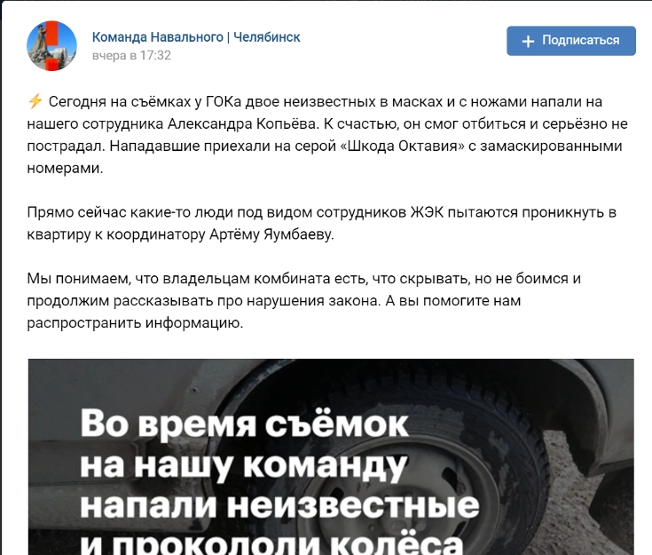 В октябре 2020 года соратник Навального заявил о нападении во время съемок у Томинского ГОКа. До этого на него дважды нападали в Новосибирске.