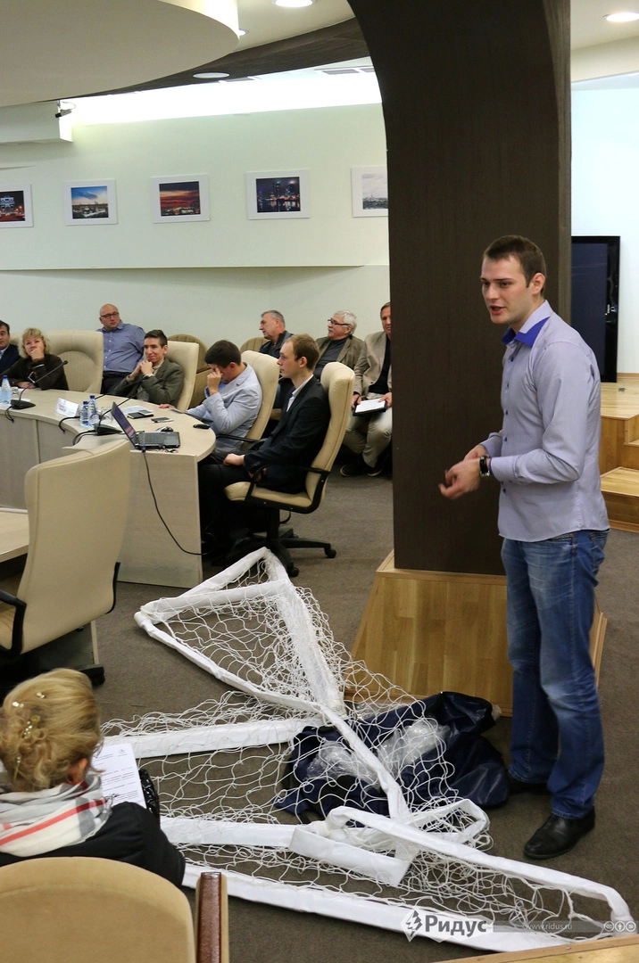 Общим стало стремление создать благоприятные условия для занятий командными видами спорта, например футболом. Так специалист отдела продаж ПКФ Авира Владислав Георгиевсий, представил в аудитории прочные надувные ворота для тренировок по футболу. С их помощью можно создавать фубольную площадку там, где нет привычных железных ворот, что облегчит тренировки для непрофессиональных спортсменов.