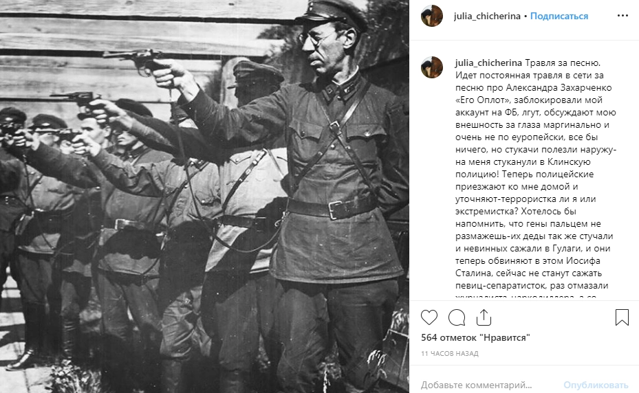 «Стукачи полезли наружу — на меня стуканули в клинскую полицию! Теперь полицейские приезжают ко мне домой и уточняют — террористка ли я или экстремистка? Хотелось бы напомнить, что гены пальцем не размажешь — их деды так же стучали и невинных сажали в Гулаги», — возмущается певица.