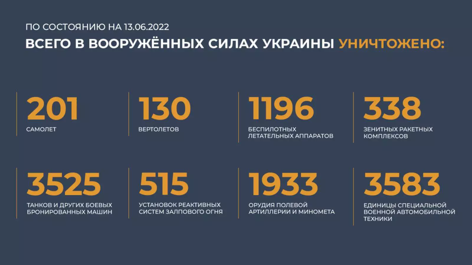 Всего с начала проведения специальной военной операции уничтожены 201 самолет, 130 вертолетов, 1196 беспилотных летательных аппаратов, 338 зенитных ракетных комплексов, 3525 танков и других боевых бронированных машин, 515 установок реактивных систем залпового огня, 1933 орудия полевой артиллерии и минометов, 3583 единицы специальной военной автомобильной техники.