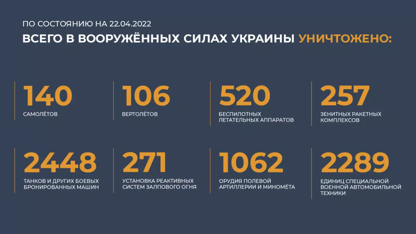 «С начала проведения специальной военной операции уничтожены 140 самолетов, 106 вертолетов, 520 беспилотных летательных аппаратов, 257 зенитных ракетных комплексов, 2448 танков и других боевых бронированных машин, 271 установка реактивных систем залпового огня, 1062 орудия полевой артиллерии и миномета, а также 2289 единиц специальной военной автомобильной техники», — сообщает Минобороны.