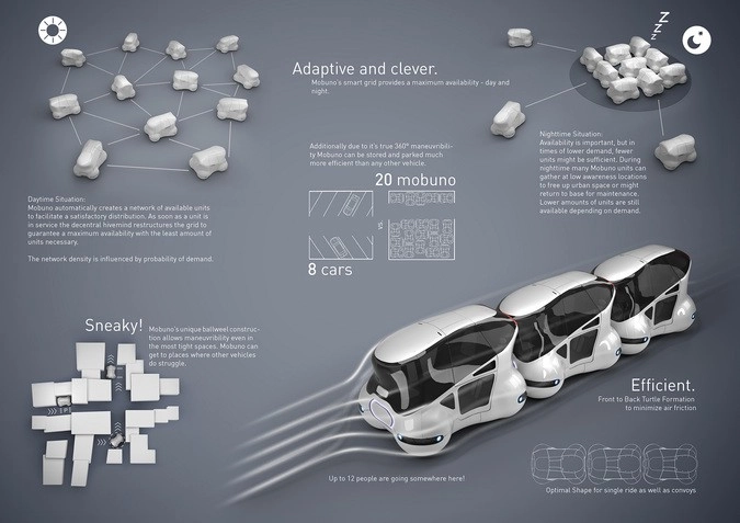 Концепция Mobuno, разработанная дизайнерской фирмой xoio и Институтом городской мобильности (IUM), представляет собой целую транспортную систему, машины которой будут не только взаимодействовать друг с другом, но и разгрузят городские дороги.