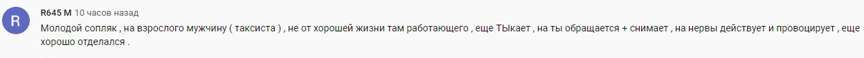 Я не обязан докидывать! Понял, что происходит что-то неладное, и включил камеру на телефоне, — отметил пассажир-подросток.В ответ на это таксист не стал отменять заказ, а предложил молодому человеку проехать часть расстояния. Заметив, что его снимают, он ударил по телефону. Подросток поспешил покинуть машину.