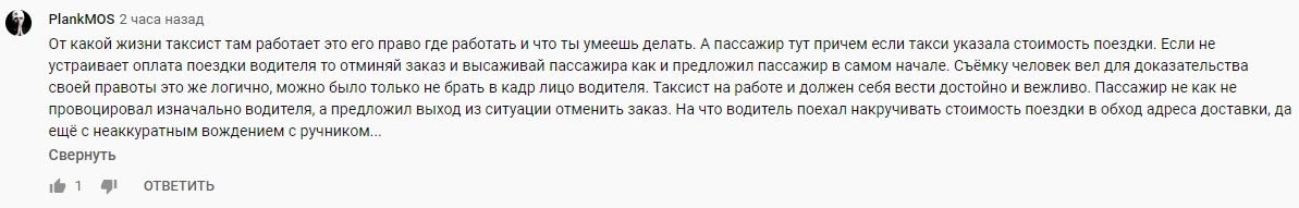 Позже водитель в одном из местных пабликов пояснил свое поведение. С его слов, он предложил пассажиру другую цену поездки, но школьник не согласился на нее и отказался выходить из машины. Таксист подчеркивает, что не давал согласия на съемку и поэтому так решительно отреагировал на нее.