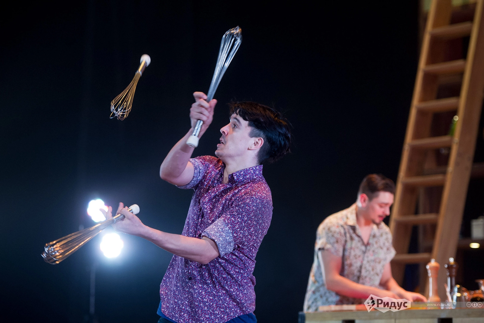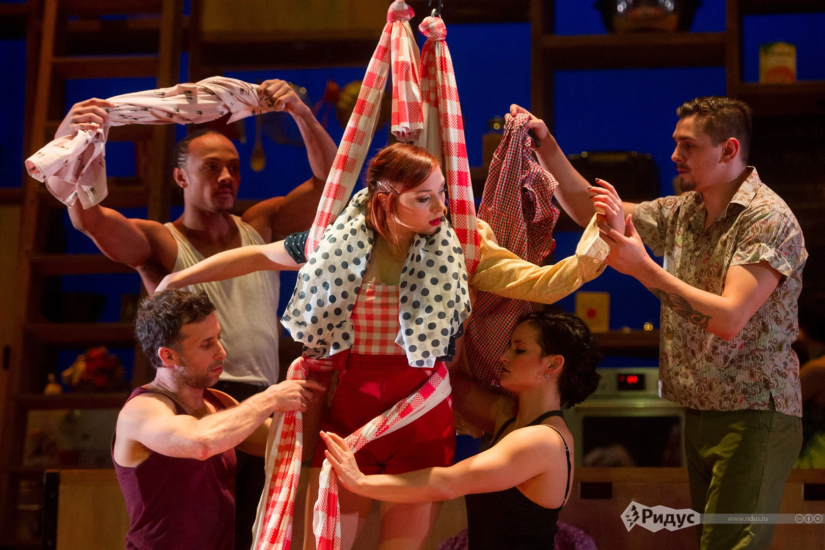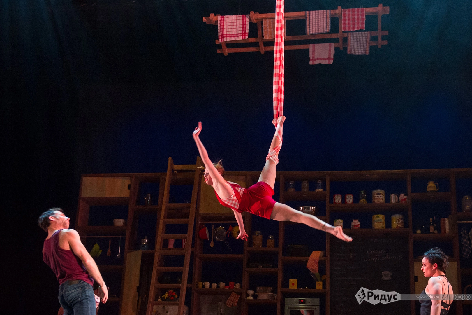 Ощущение — как будто попал на подготовку к празднику в веселой общаге клоунов. Актеры постоянно бегают по сцене, жонглируя кухонной утварью, лишь иногда прерываясь на сольные выступления своих коллег. Один из таких номеров показала Анна Киченко, воздушная акробатка с русскими корнями — тут уже начался настоящий высокий цирк с опасными и захватывающими дух пируэтами.