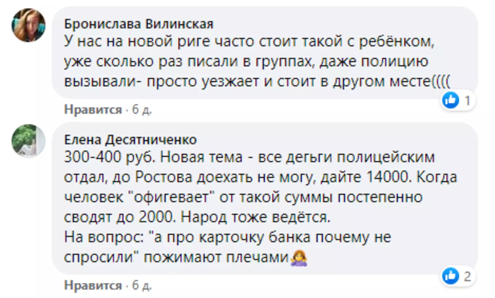 По ее словам, она ехала в такси и увидела на мосту мужчину, стоявшего с поднятой рукой рядом с машиной, в которой находился маленький ребенок. Таксист объяснил женщине, что это новый вид мошенничества. Он рассказал, что аферисты останавливают автомобилистов и просят дать на бензин хотя бы 200−300 рублей, так как топливо у них внезапно закончилось, а в машине находится ребенок, который очень устал и хочет есть.