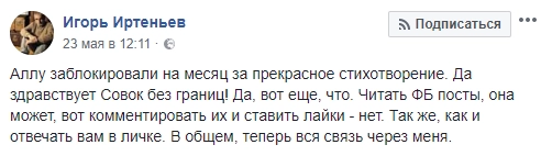 На разразившийся скандал вынужден был отреагировать и Facebook. «Аллу заблокировали на месяц за прекрасное стихотворение» — написал на своей странице ее супруг.