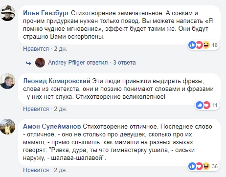 В основном же пользователи Facebook высоко оценили стихотворение Боссарт, назвав его замечательным, отличным и великолепным.