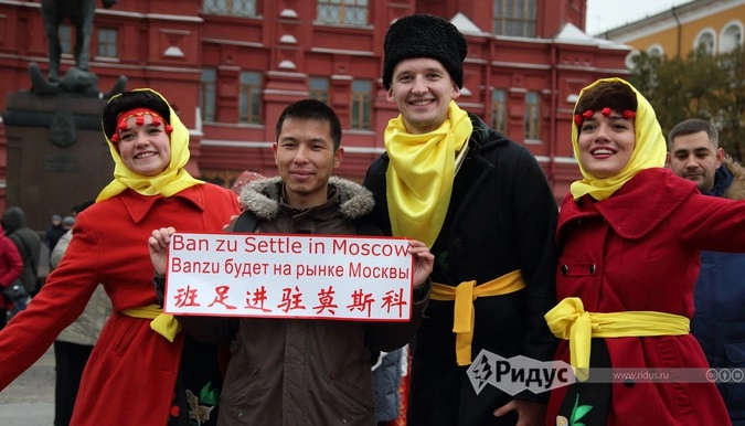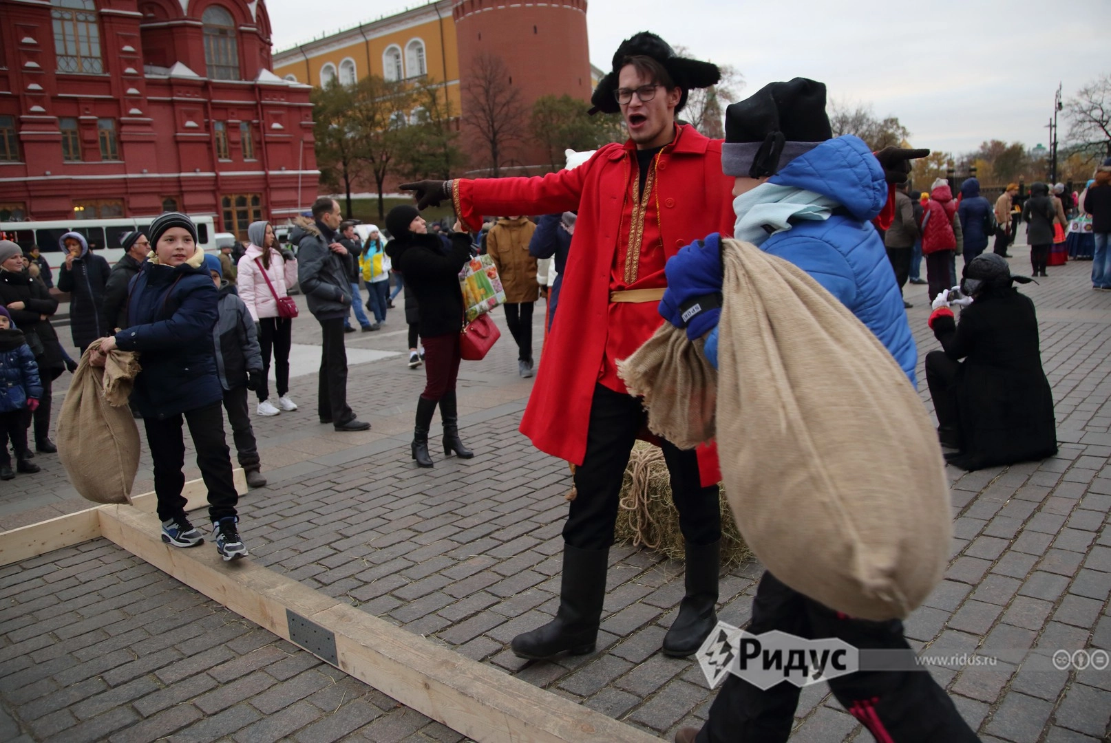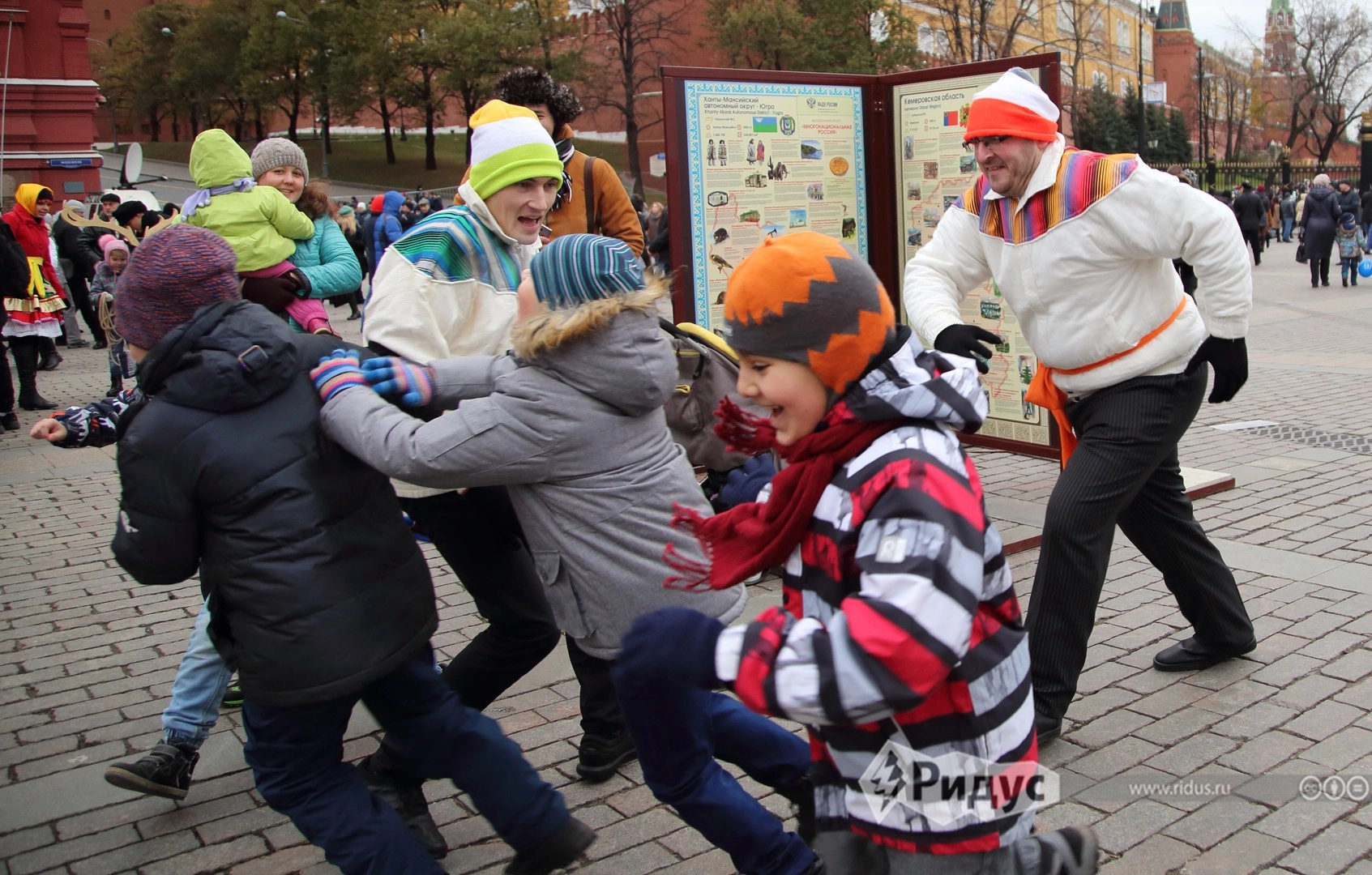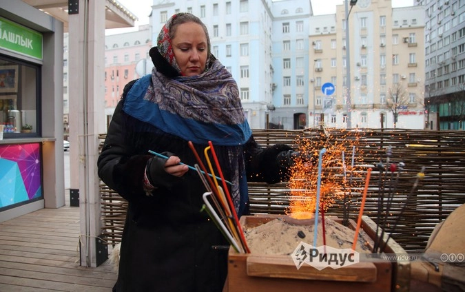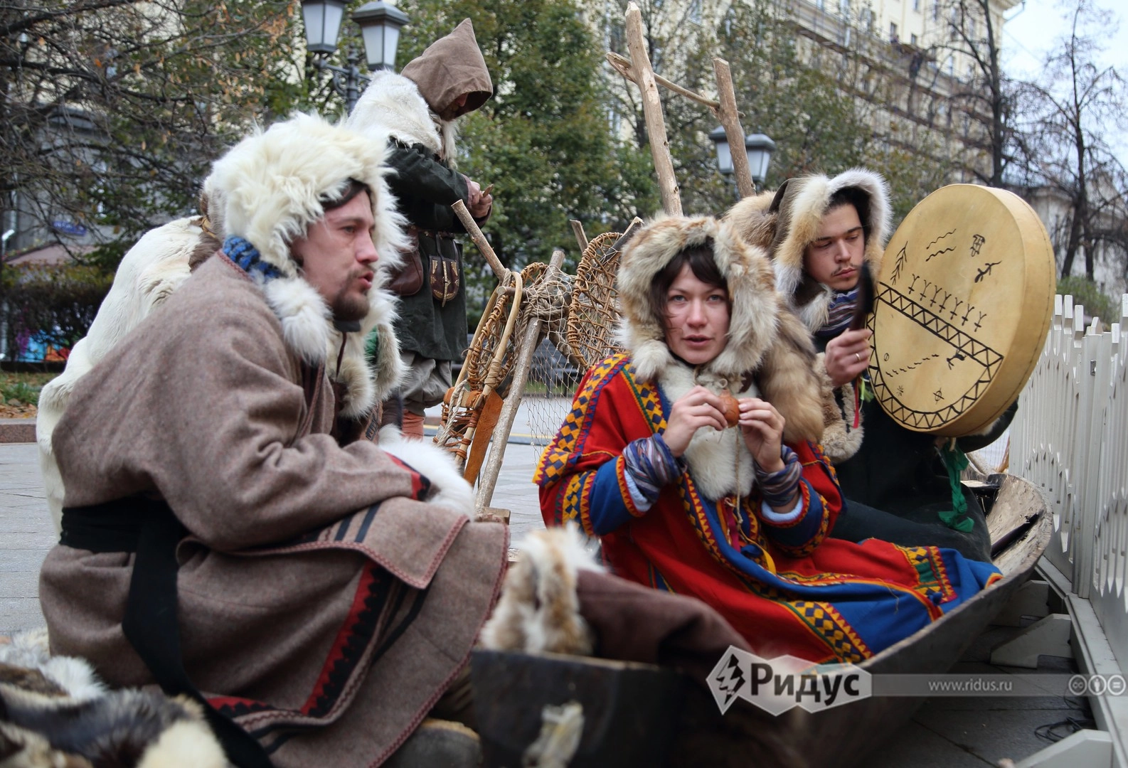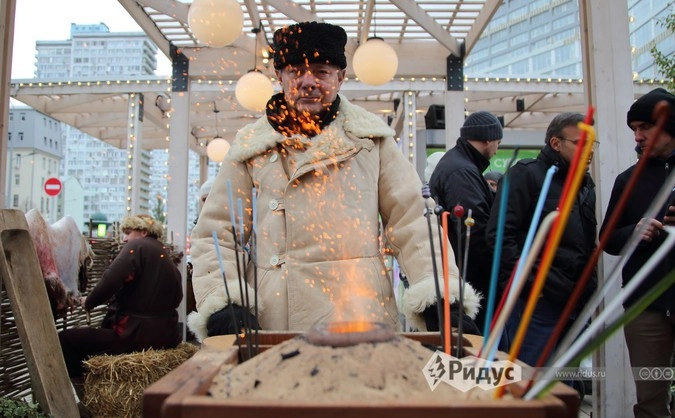 На Тверской два десятка артистов заманивали зрителей принять участие в интерактивном спектакле «Открытие Сибири». Для них устроили традиционный праздник с шаманами и провели несколько уроков, обучающих секретам охотничьего мастерства