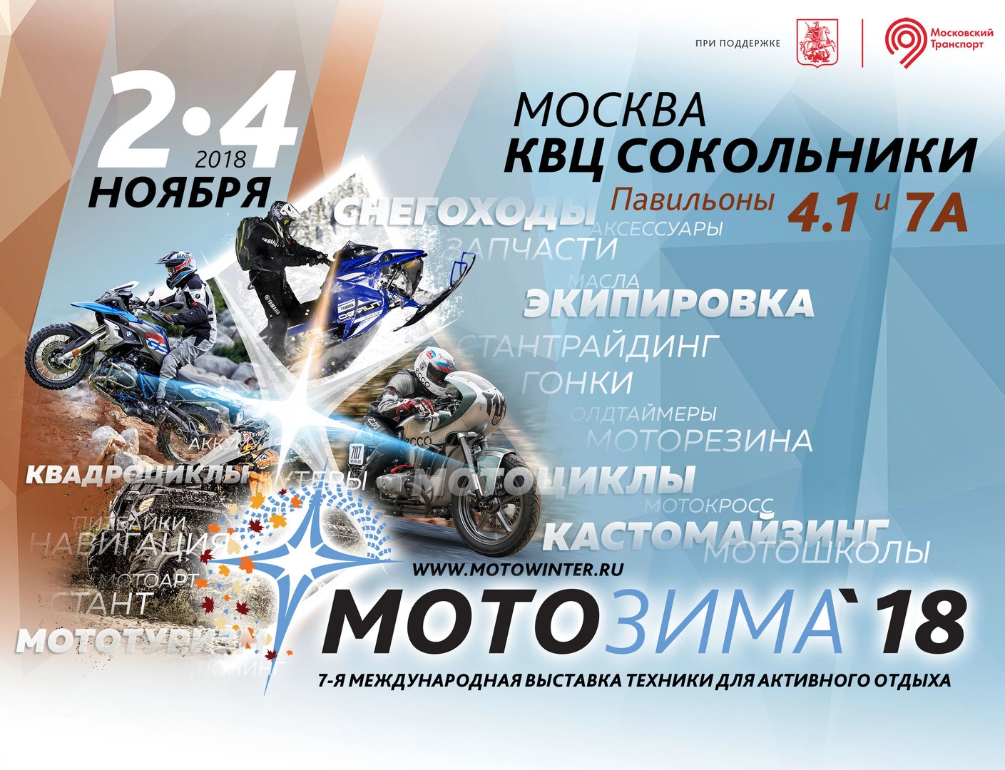 Выставка новейших моделей мотоциклов, квадроциклов и скутеров со всего света, международный клуб мототуристов, интерактивные квесты, увлекательные мастер-классы и захватывающие показательные выступления — все это ждет жителей и гостей столицы на главной выставке техники для активного отдыха «Мотозима-2018».