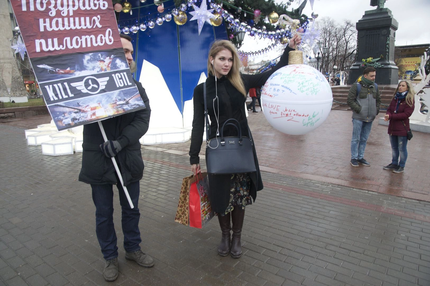 В акции также приняла участие активистка Национально-Освободительного Движения Мария Катасонова, известная своей активной поддержкой российских летчиков в соцсетях и на уличных акциях. Мария пришла по своей инициативе, выразила слова поддержки и помогла собирать слова благодарности у изрядно замерзших редакторов портала.