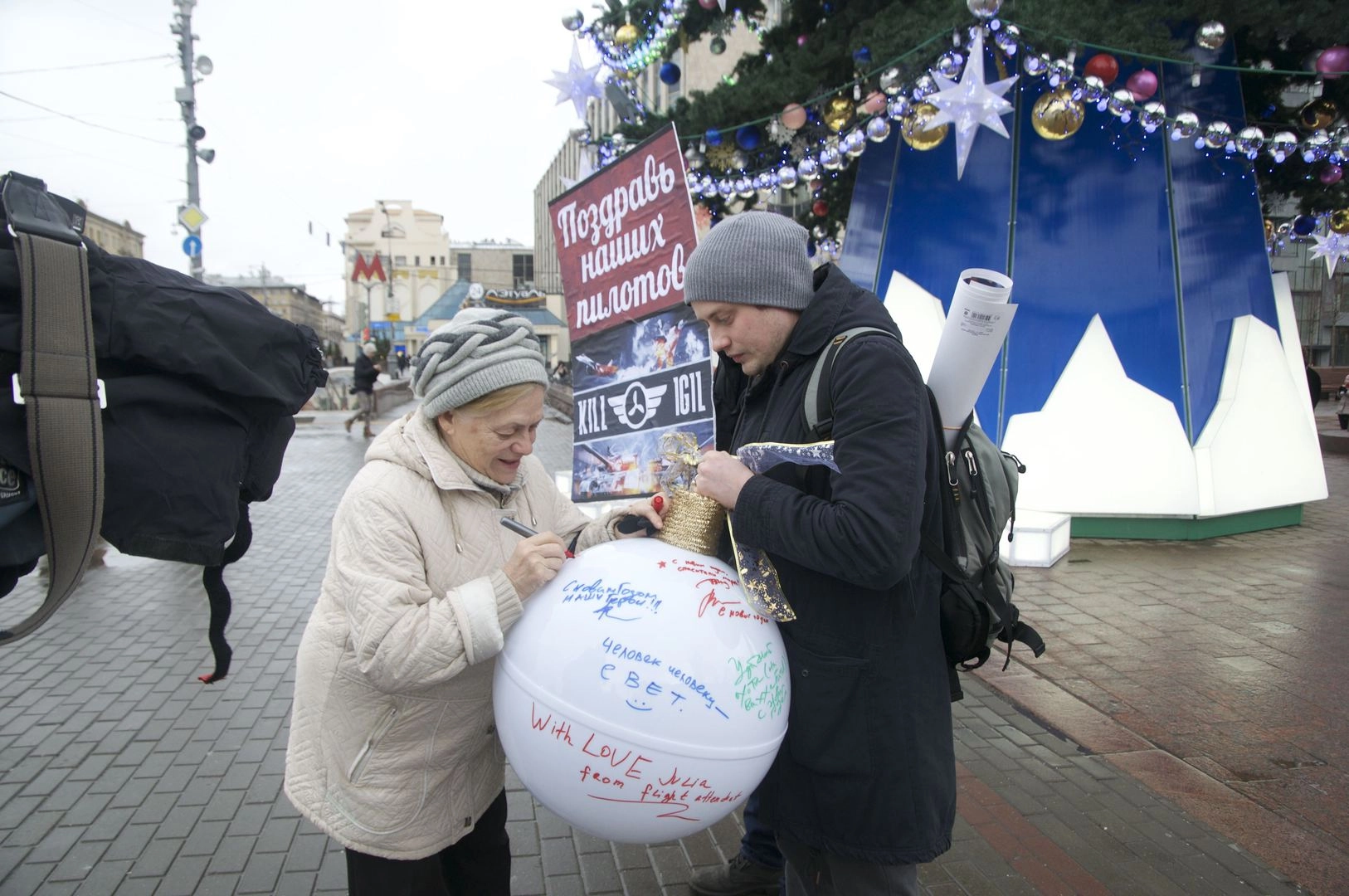 На большом новогоднем елочном шаре любой желающий оставлял свои пожелания летчикам. Люди желали нашим землякам здоровья, сил и скорейшего возвращения домой. Также многие выражали слова благодарности пилотам, которые сражаются с мировым терроризмом.