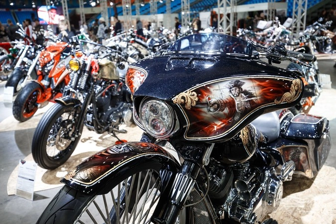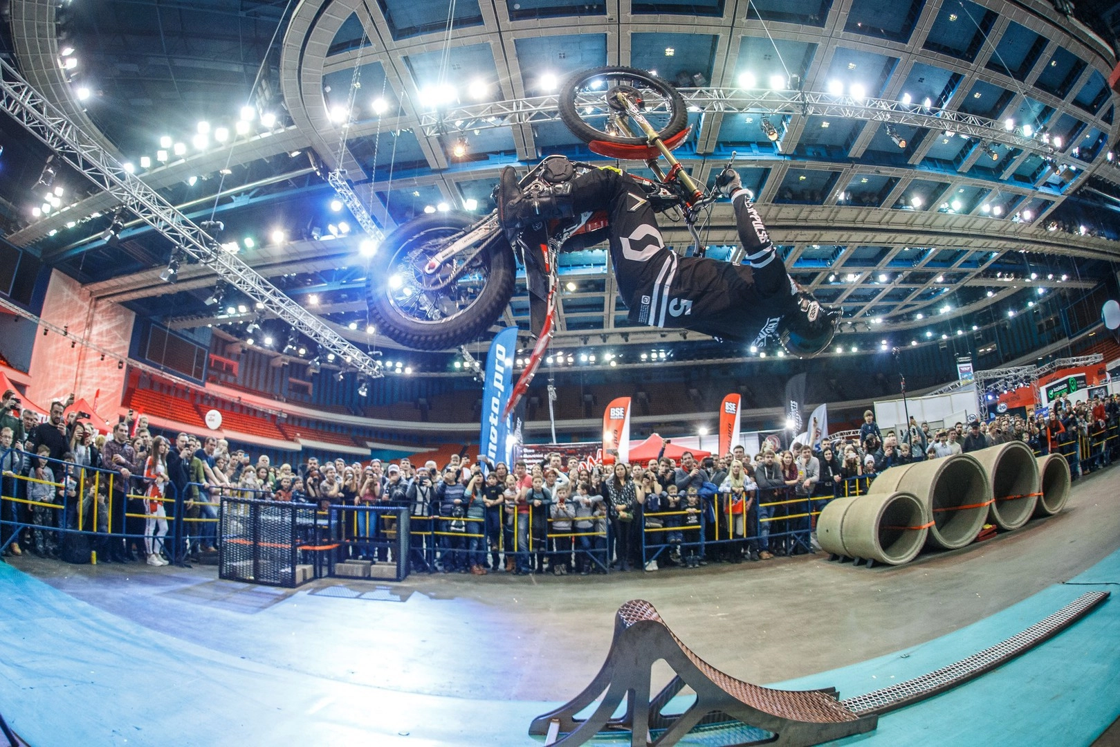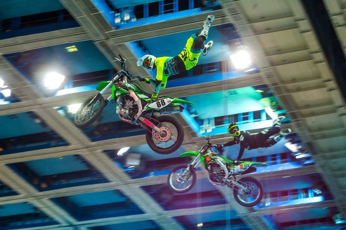 Кастомы — это красиво, но не всегда быстро. Для любителей скорости прямо на арене «Олимпийского» организовали большую спортивную зону Motul Extreme Show, за которой было удобно наблюдать с трибун в перерывах между изучением экспонатов. Фристайлеры прыгали с огромной рампы через весь зал, взлетая под самый потолок.