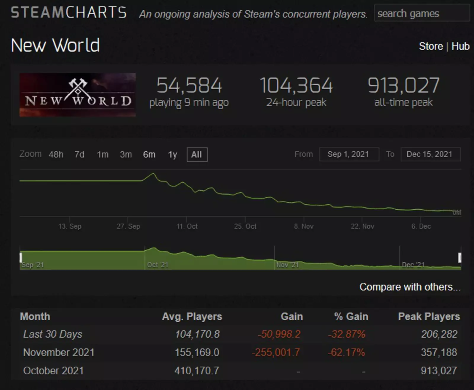 Сейчас ситуация несколько стабилизировалась, но количество игроков уже далеко не то, что было при запуске: в настоящее время лишь сто тысяч человек играют в New World, а рейтинг всё ещё держится на отметке «смешанный».