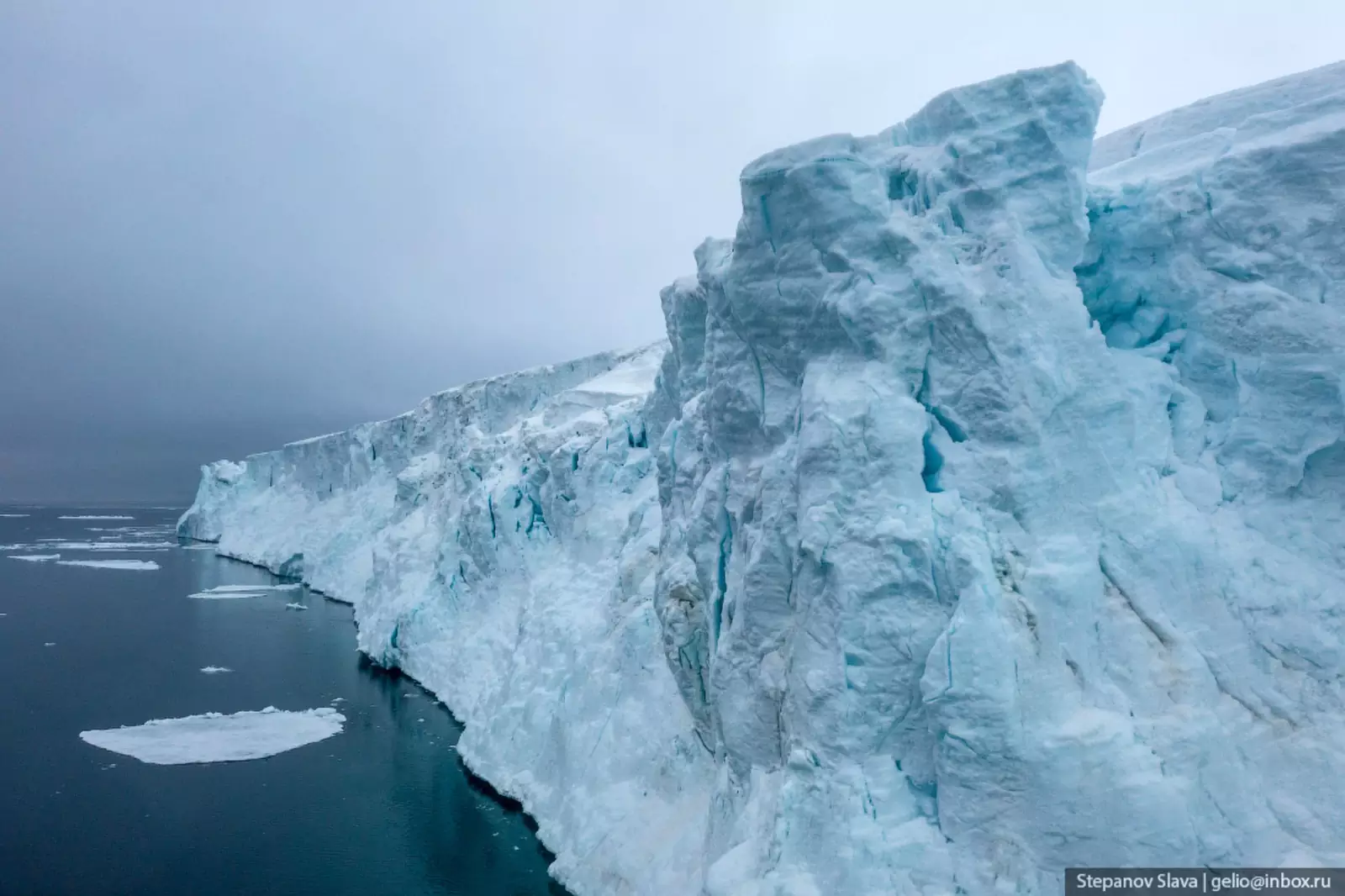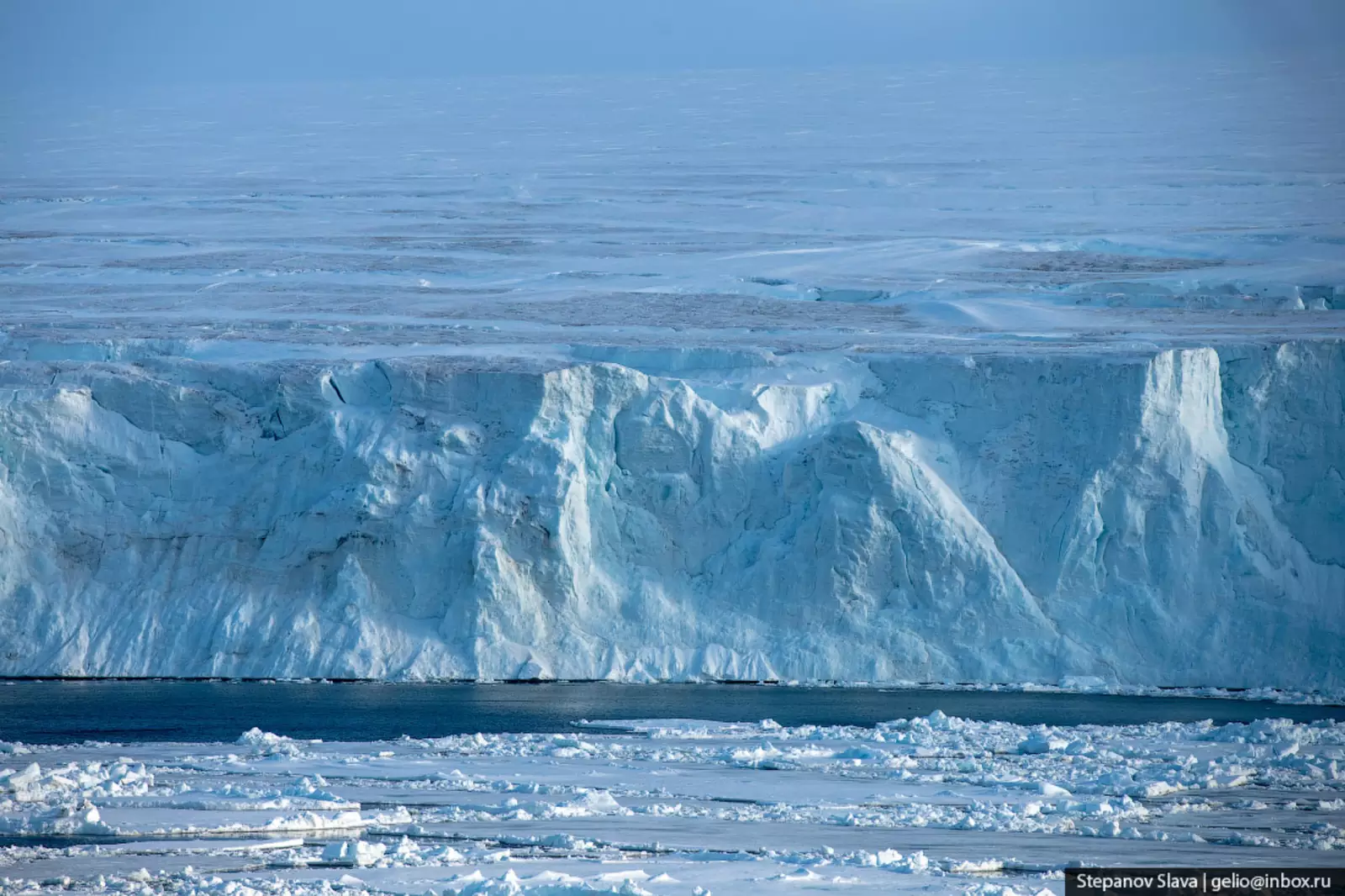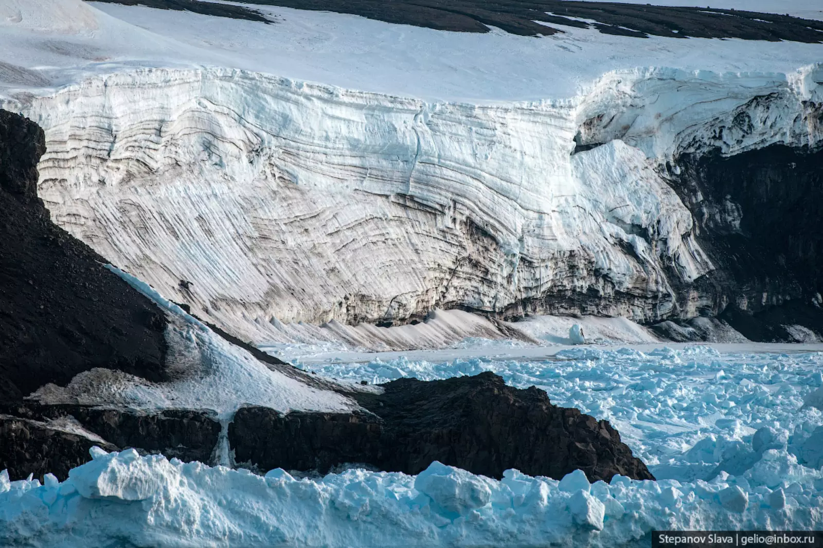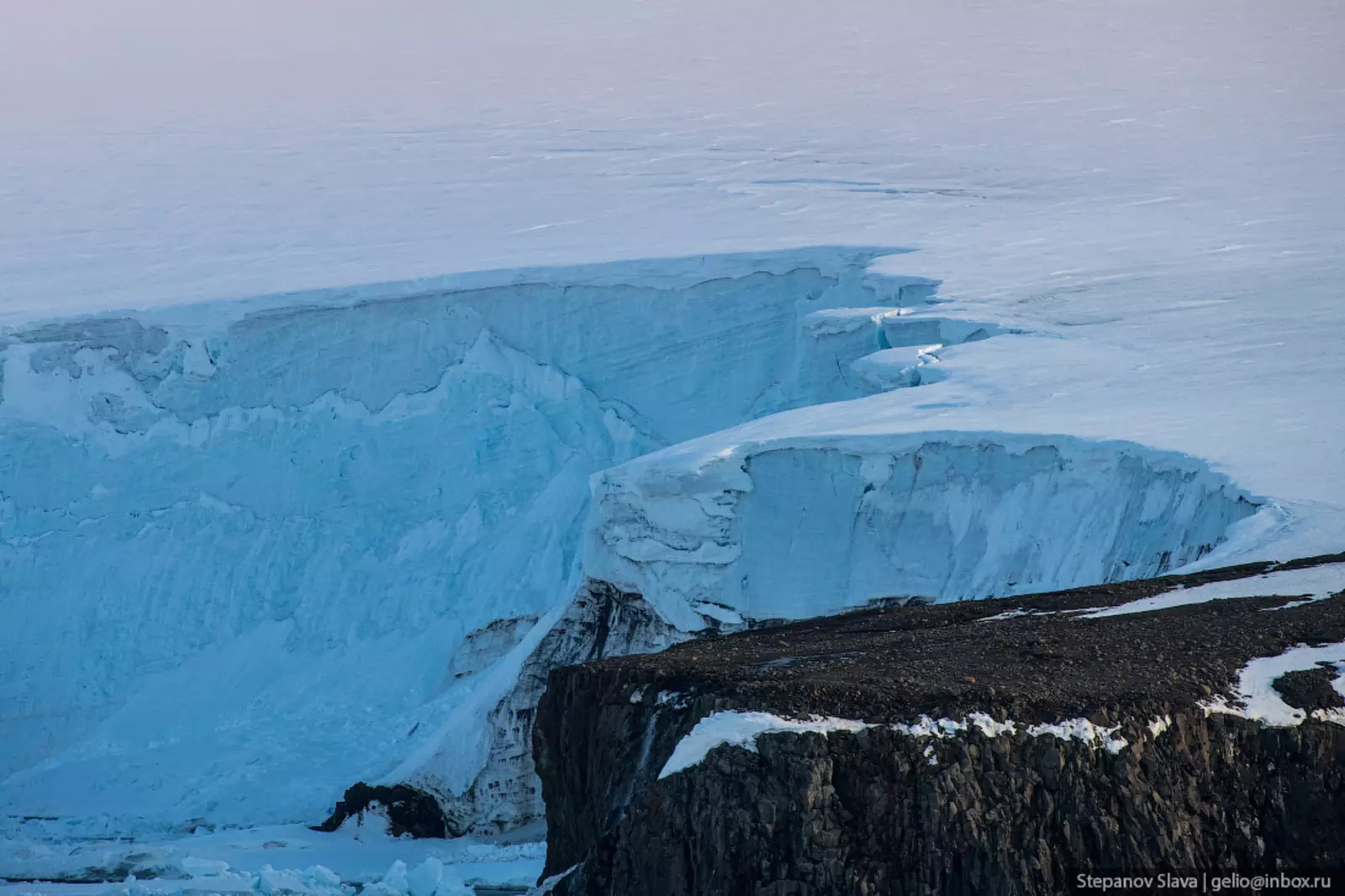 2. Мыс Флигели считается самой северной островной точкой Европы и России. Он, как и весь остров Рудольфа, почти полностью покрыт слоем льда. Ледники, которые сползают с островов в море, образуют огромные айсберги.