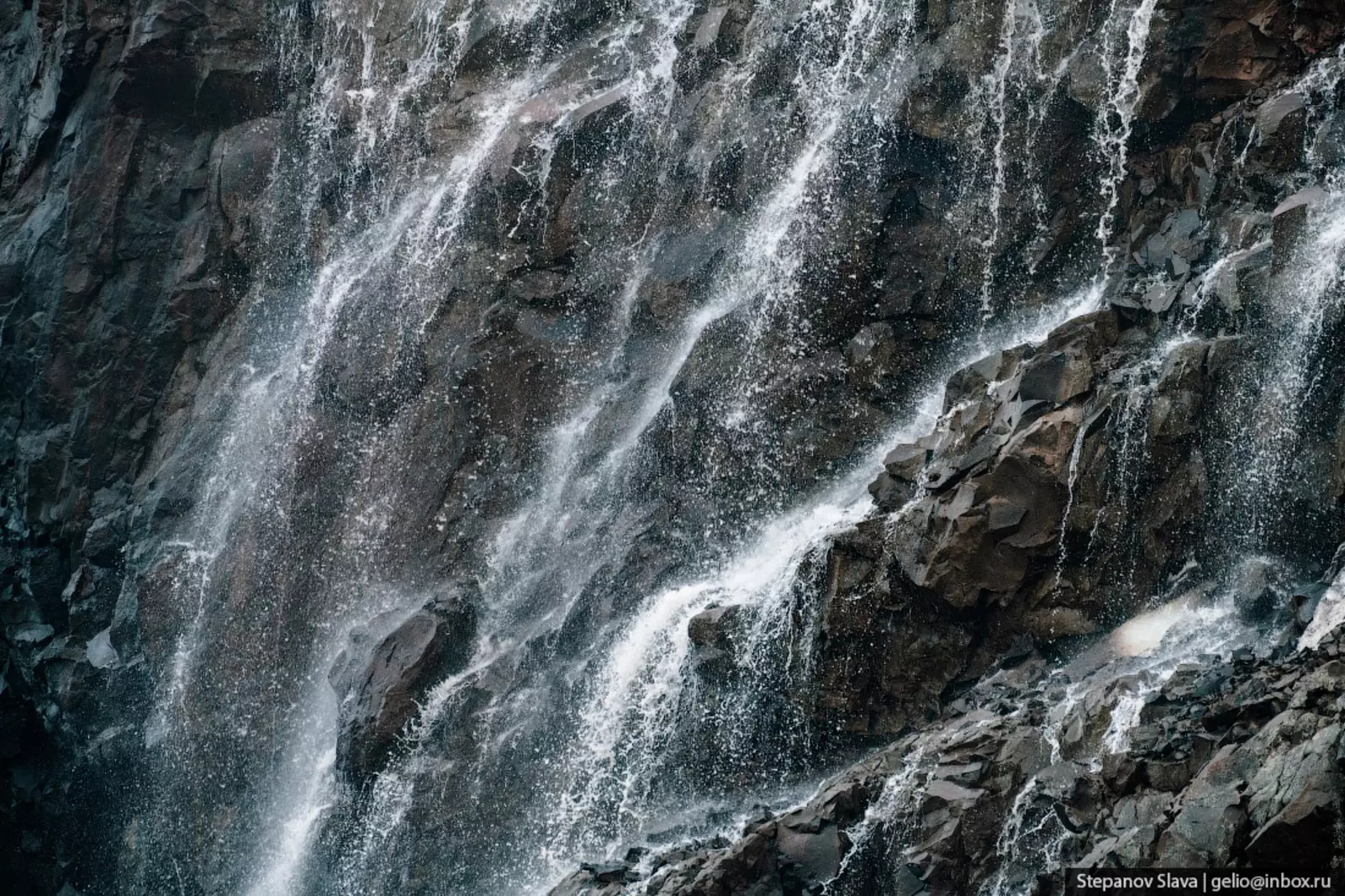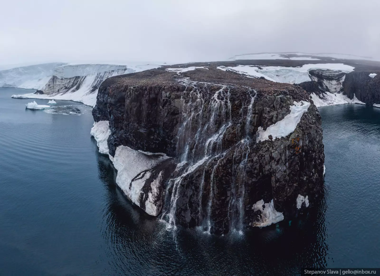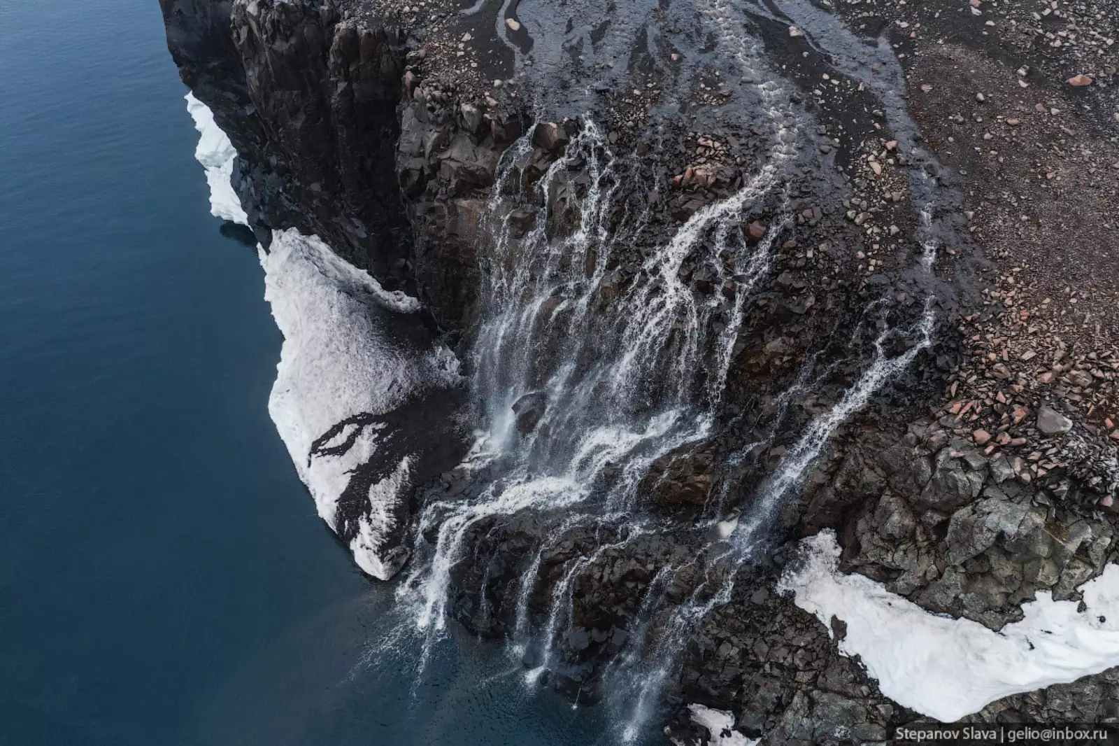 9. Когда краткие дни оттепели кончаются — вода замерзает. Увидеть водопады на мысе Флигели можно только летом.