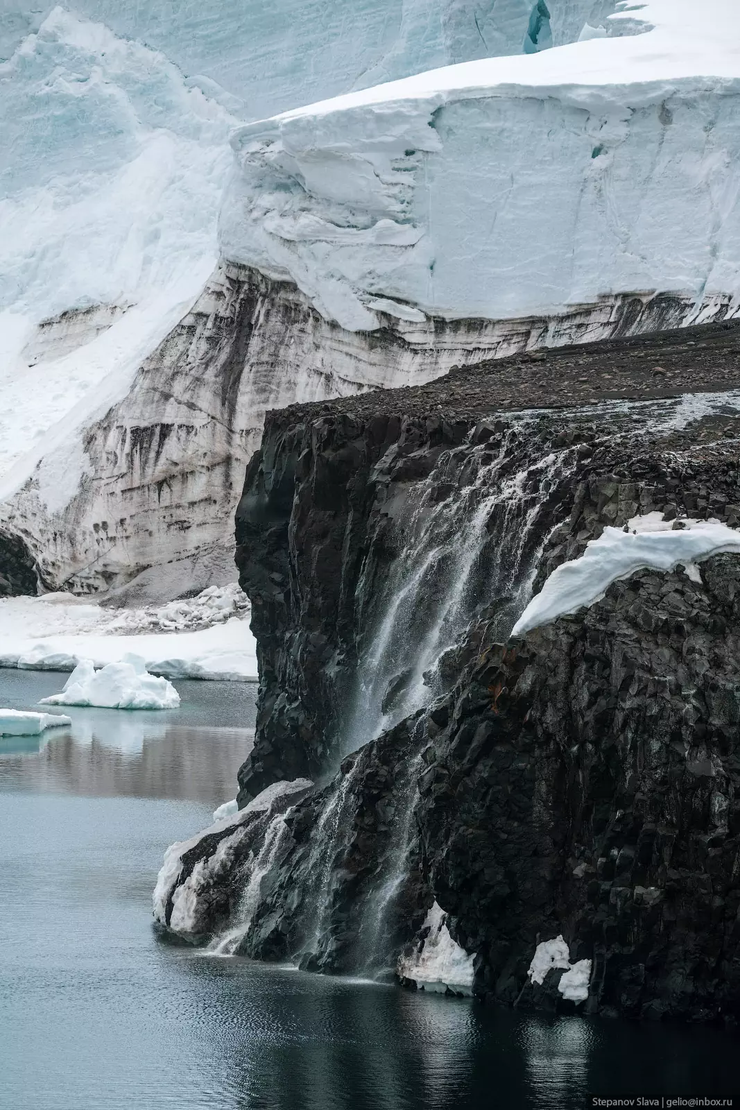 6. Острова архипелага почти целиком покрыты льдами — толщина достигает 500 м. Когда лёд тает, образуются водопады.