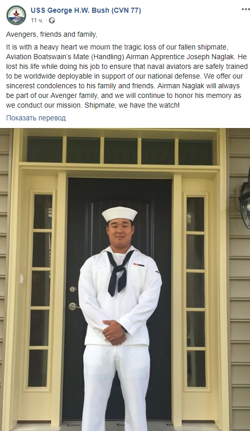 Экипаж авианосца выразил соболезнования родственникам погибшего на своей странице в Facebook.