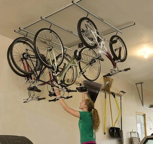 Так ваш велосипед точно не будет вам мешать. Следите за тем, чтобы крепежные механизмы — крюки и лебедки были прочными. Ведь нет ничего неожиданней, чем свалившийся на голову велосипед.