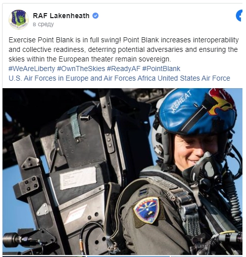На одной из фотографий с учений Point Blank, опубликованных на странице 48-го истребительного авиаполка ВВС США в Facebook, у летчика 492-й эскадрильи на рукаве оказалась российская символика.