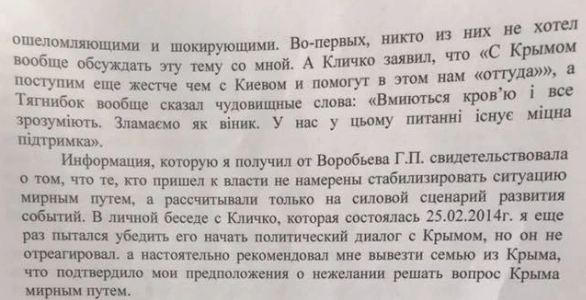 Из документа следует, что Ильин пытался донести до новой власти настроения жителей полуострова, но тогдашние верховный главнокомандующий Александр Турчинов и премьер Арсений Яценюк игнорировали накаляющуюся обстановку на полуострове. По его словам, о ситуации знали мэр Киева Виталий Кличко и лидер националистической партии «Свобода» Олег Тягнибок.