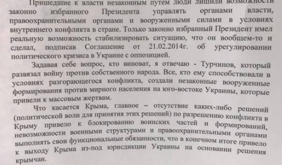 Из протокола следует, что новая власть не предприняла никаких действий «по разрешению конфликта в Крыму». Особенно часто в этом контексте упоминается Турчинов, как человек, который «обезглавил Вооруженные силы Украины» и «развязал войну против собственного народа».