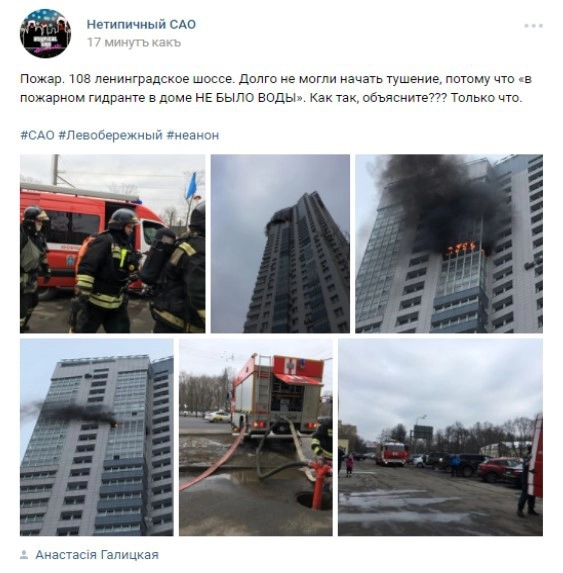 Как сообщили в группе «Нетипичный САО» в социальной сети «ВКонтакте», специалисты долго не могли приступить к тушению пожара, так как «в пожарном гидранте в доме не было воды».