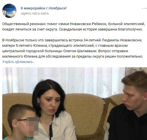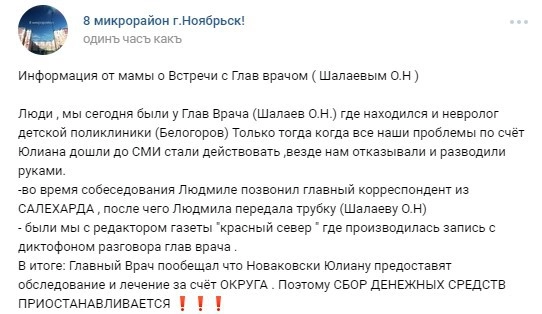 «Вопрос решен положительно. У нас состоялся с мамой ребенка содержательный и обстоятельный разговор. Мы поняли друг друга. Юлиан будет обследоваться в одном из лучших федеральных центров страны. Обследование и лечение для него будет бесплатным за счет города и округа. Были недопонимания, мы сели, поговорили, инцидент исчерпан. Вместо того чтобы сразу давать какую-то информацию в соцсеть, просто нужно подойти к главному врачу и решить на месте все проблемы», — цитируют врача в группе «8 микрорайон г.Ноябрьск!» во «ВК».