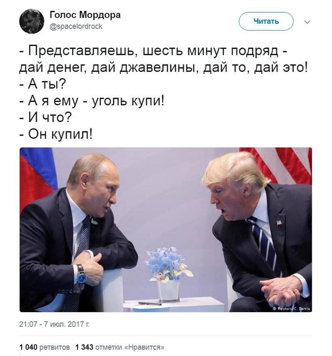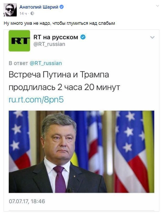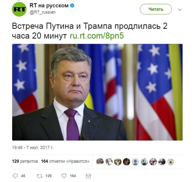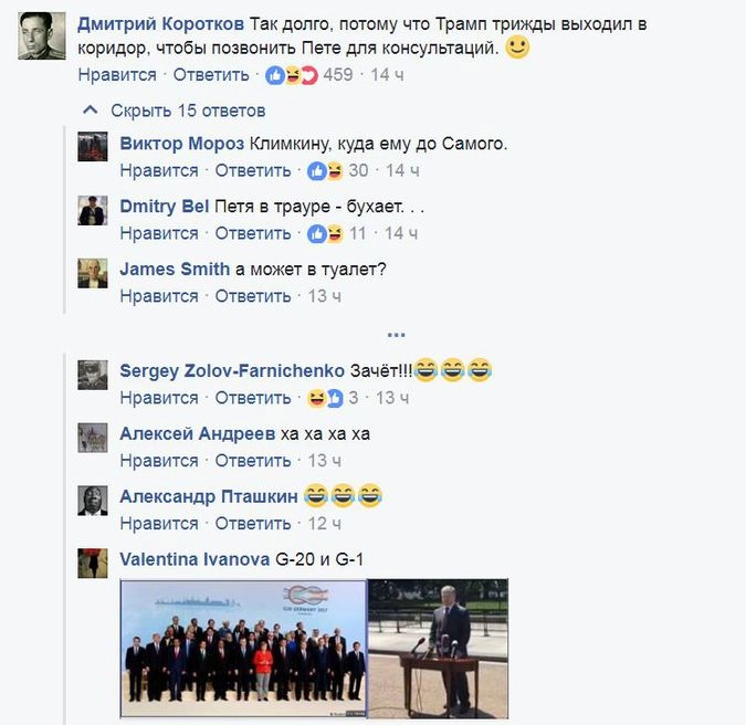 Президент Украины Петр Порошенко стал предметом насмешек в Рунете после окончания двусторонней встречи российского и американского лидера на саммите «Большой двадцатки» в Германии.