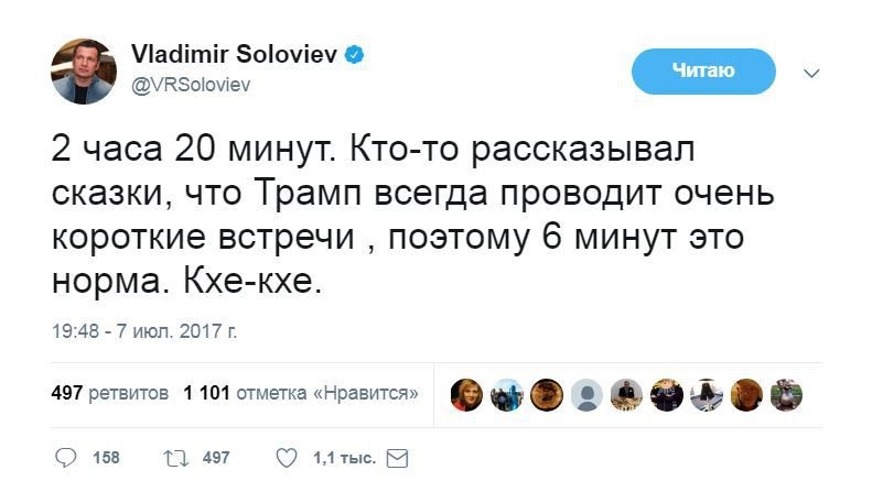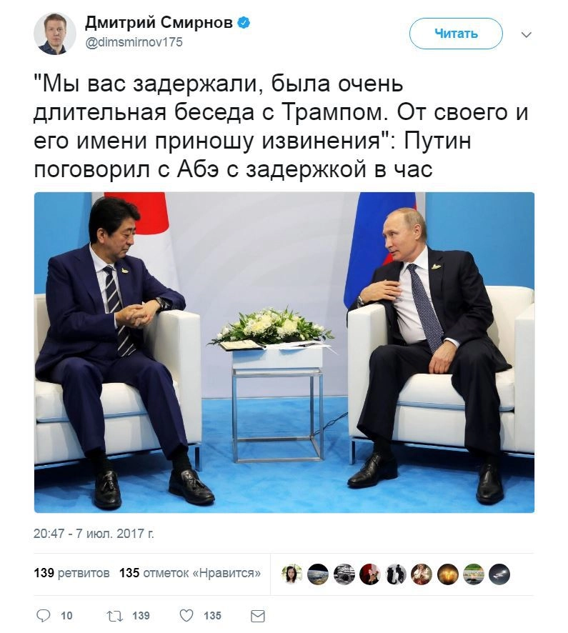 Напомним, после встречи с Дональдом Трампом у Владимира Путина не было подхода к прессе, так как он спешил на встречу с премьер-министром Японии Синдзо Абэ. Однако уже на ней, российский лидер рассказал журналистам, о чем так долго разговаривал с американским коллегой.