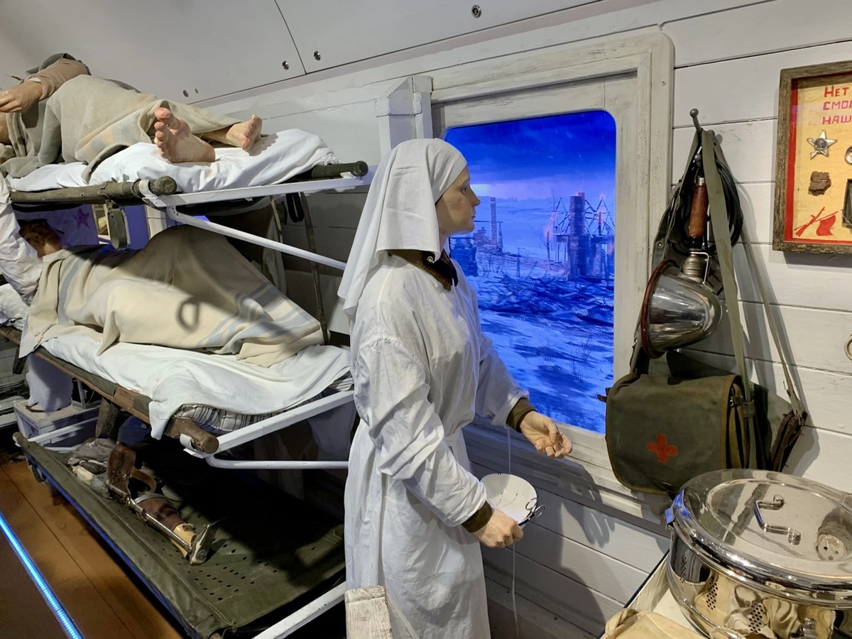 В составе поезда восемь вагонов. Каждый из них оформлен в виде вагонов времен Великой Отечественной войны. Есть гражданский пассажирский вагон, баня, теплушка с бойцами, отправляющимися на фронт, госпиталь, штаб и вагон для пленных.
