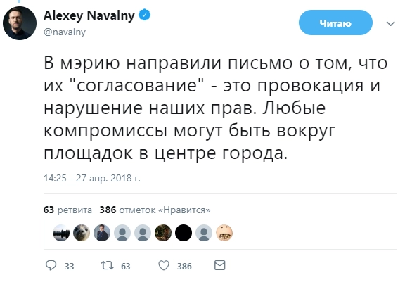 Блогер Алексей Навальный отказался от предложенного мэрией Москвы варианта проведения акции протеста на внешней стороне проспекта Академика Сахарова. По его мнению, митинг должен состояться только в пределах Садового кольца.