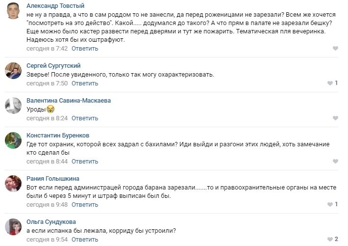 По данному факту сейчас проводится проверка. Устанавливаются причастные лица, решается вопрос о квалификации их действий, — заявили в пресс-службе УМВД по ХМАО.По информации издания, столь необычное зрелище у дверей родильного дома могло быть приурочено к рождению ребенка в семье одной из мусульманских пациенток. В исламе такой обряд называется «акика».