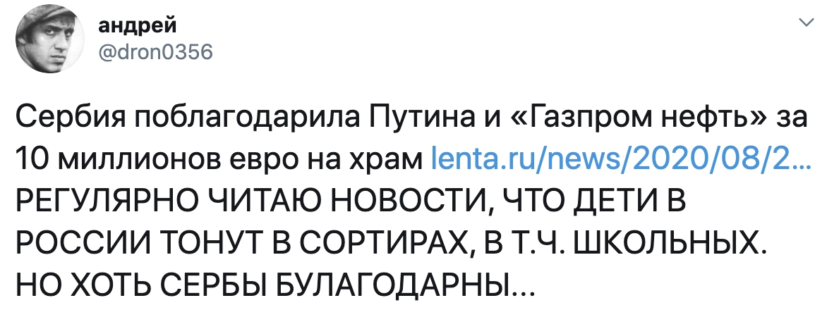 «Хочу поблагодарить наших российских друзей, президента Владимира Путина и „Газпром нефть“ за 10,5 миллионов евро», — цитирует Вучича Telegram-канал RIA_Kremlinpool.