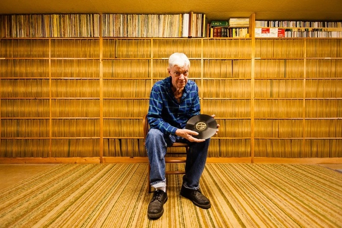 Джо Буссард в подвале своего дома во Фредерике, штат Мэриленд, показывает одну из своих самых редких виниловых пластинок. В середине все бумажные упаковки выцвели — результат того, что Джо постоянно просматривает, сортирует и достает свои любимые. Он собирает эту коллекцию вот уже 60 лет. (Eilon Paz)