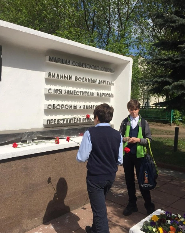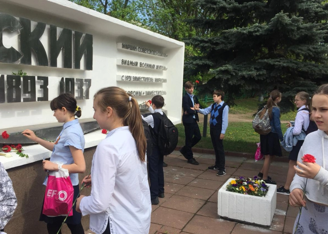 Ученики пятого класса московской школы в честь памятной акции 9 мая возложили цветы к памятнику маршалу СССР Михаилу Тухачевскому, расстрелянному за несколько лет до начала Великой отечественной войны.