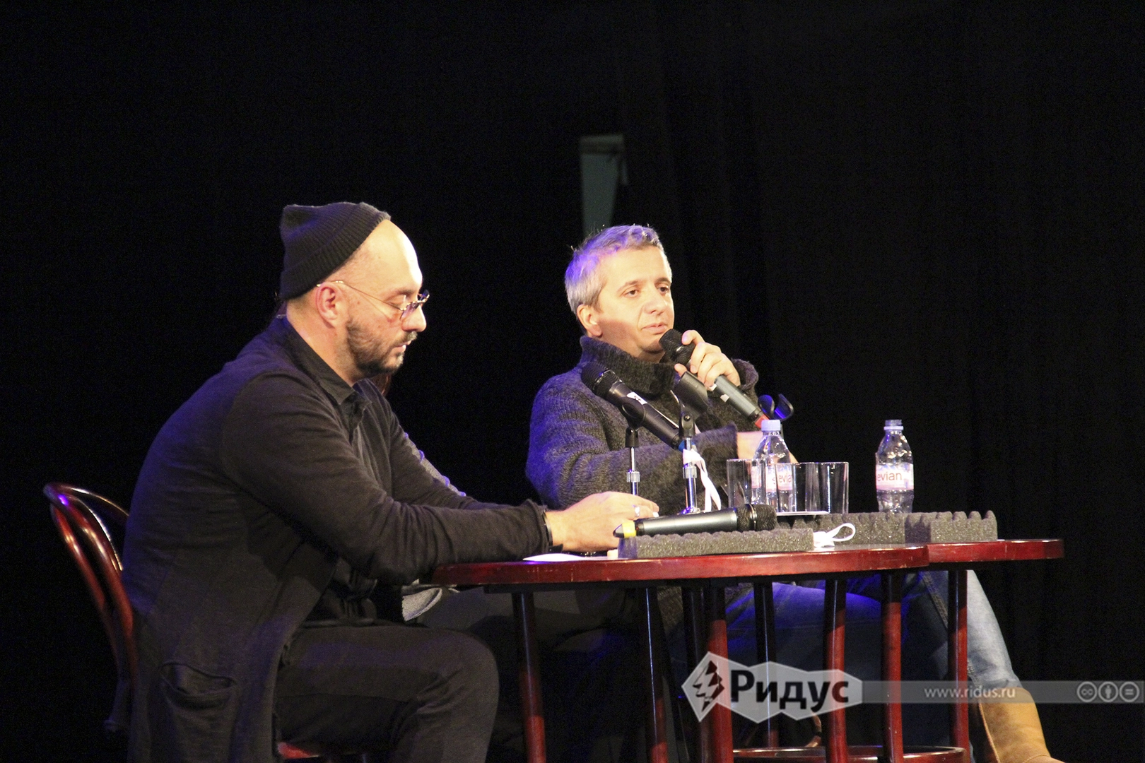 Последней точкой нашего маршрута «Ночи искусств-2014» стала ночная встреча с режиссерами Кириллом Серебренниковым и Константином Богомоловым. В Театральном центре на Страстном бульваре самые актуальные и противоречивые современные театралы собрали несколько сотен слушателей, части из которых так и не удалось попасть в зал.
