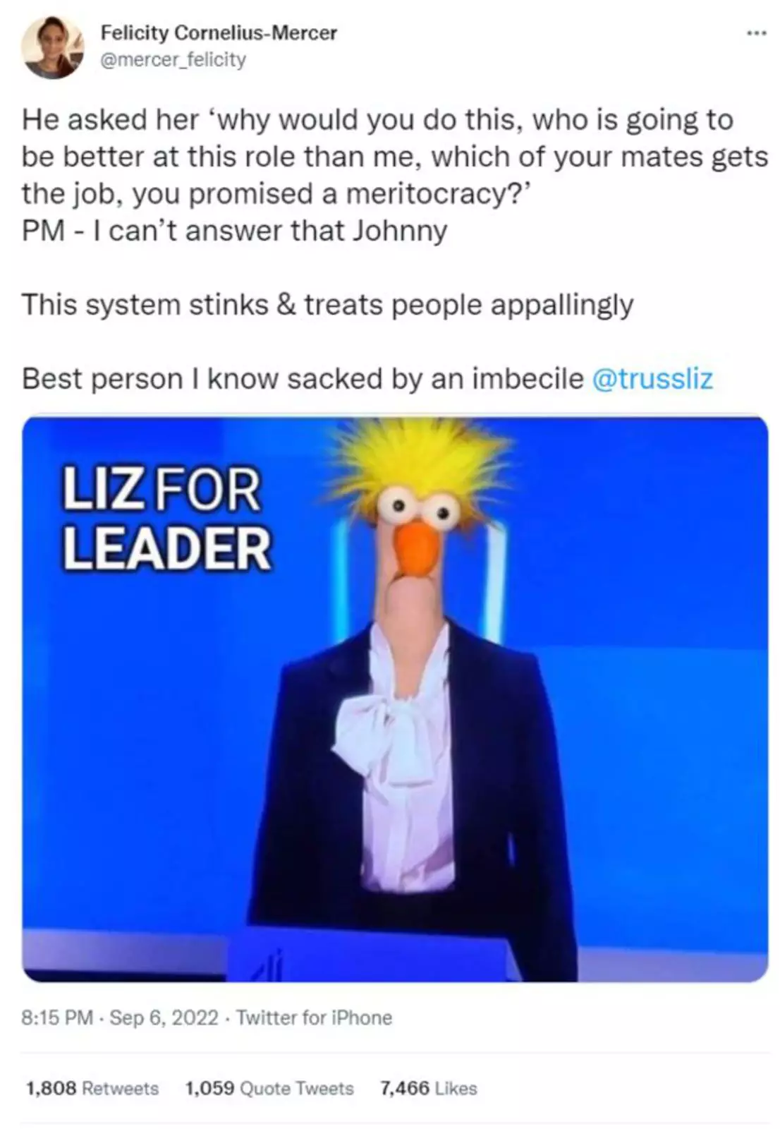«Я должен признать, что никогда не буду обладать качествами, необходимыми для прочного успеха в политике в ее нынешнем виде, и, чтобы быть справедливым по отношению к моей замечательной семье, я должен обдумывать свое будущее», — заявил он.Его жена пошла дальше, разместив в Twitter карикатуру на Лиз Трасс в образе персонажа «Маппет-шоу», спрашивающего: «Почему вы это делаете, кто будет лучше в этой роли, чем я, кто из ваших товарищей получает работу, когда вы обещали меритократию?» Премьер-министр отвечает сама себе: «Я не могу ответить, Джонни».