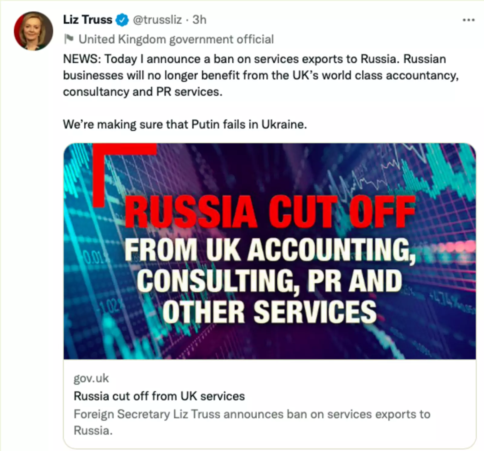 Министр иностранных дел Великобритании Лиз Трасс объявилао запрете на экспорт услуг, включая управленческий консалтинг, бухгалтерский учет и связи с общественностью, в Россию. Как особо отмечено в заявлении правительства Великобритании, санкции коснутся и тех, кто «стоит за порочной путинской дезинформационной кампанией, в том числе RT и Sputnik online».