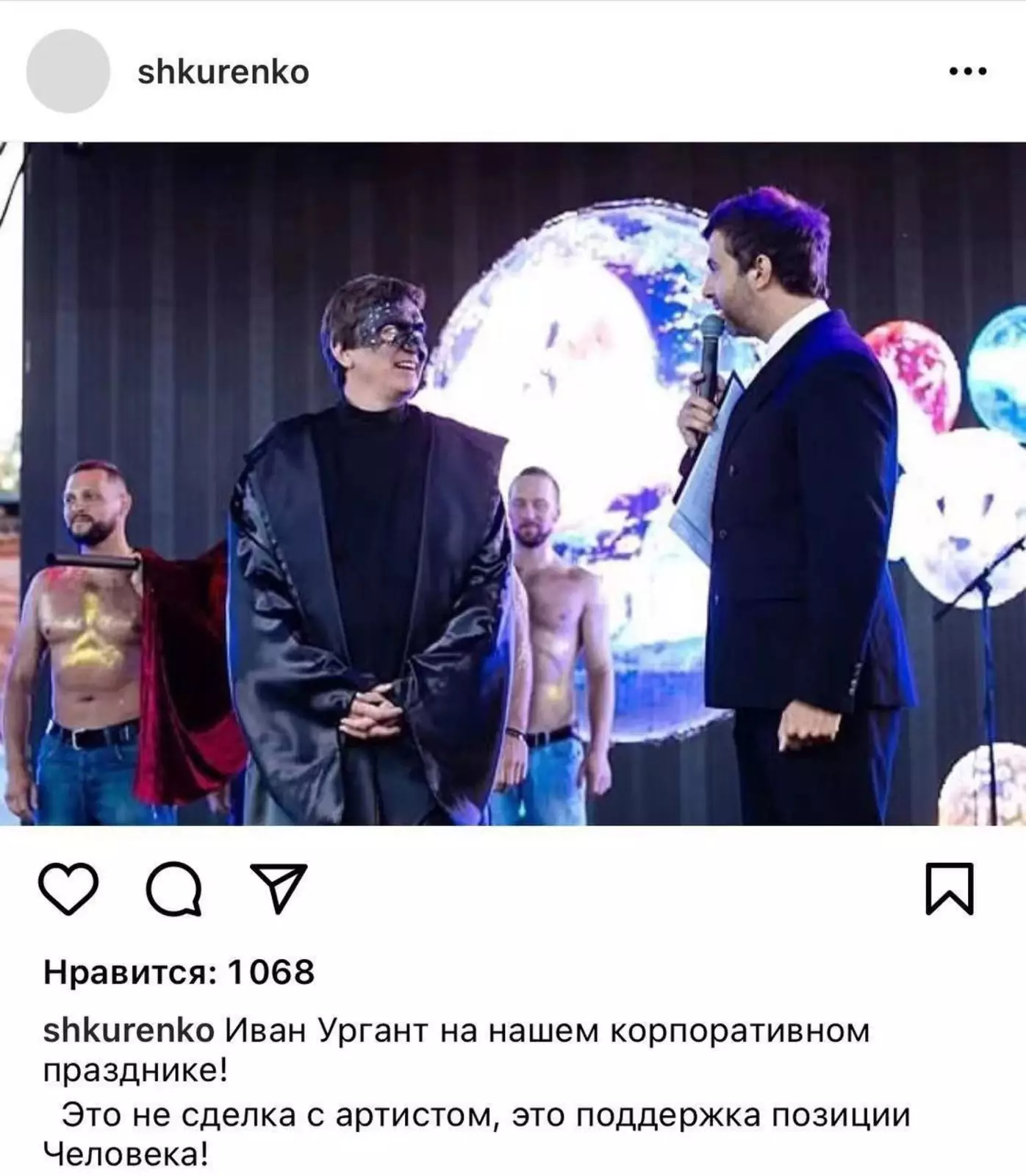 В соцсетях Шкуренко так объяснил появление Урганта на корпоративе: «Это не сделка с артистом, это поддержка позиции Человека!»