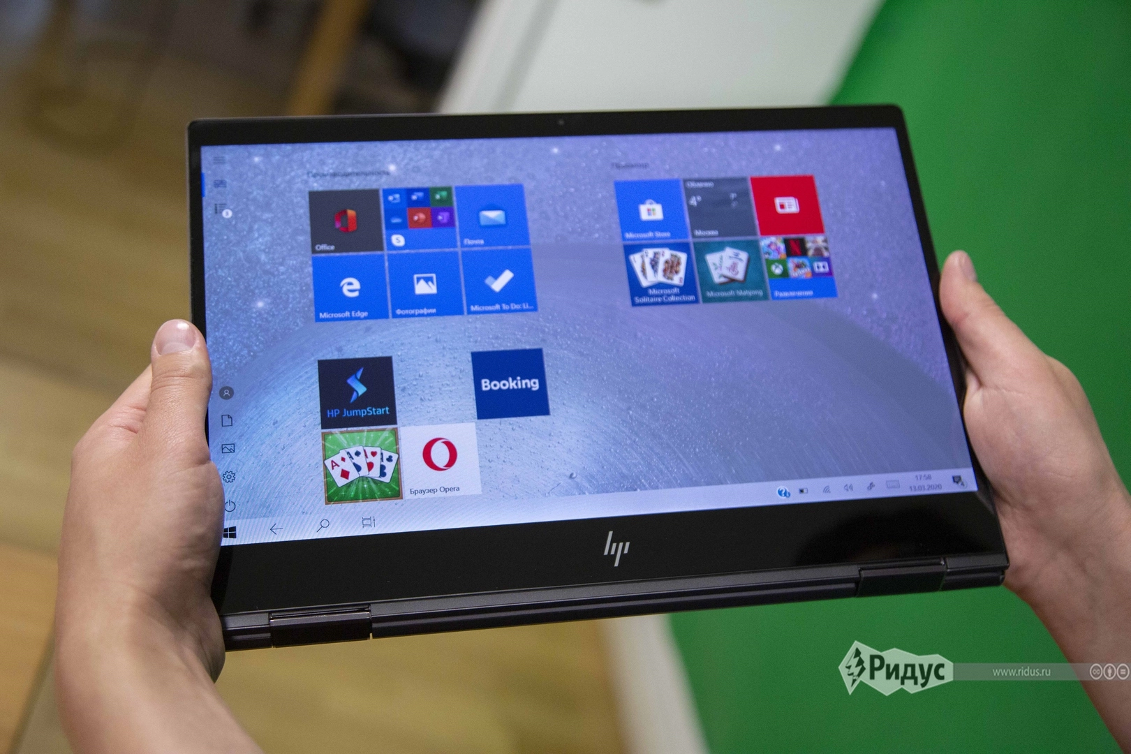 HP ENVY X360 13 выполнен в редко встречающемся форм-факторе трансформера. То есть его дисплей поворачивается на 360 градусов, что позволяет превратить его в планшет. Специально для это девайс оснащен сенсорным дисплеем. Благодаря такому форм-фактору появляются различные варианты использования устройства — как ноутбук, как планшет и в режиме демонстрации.