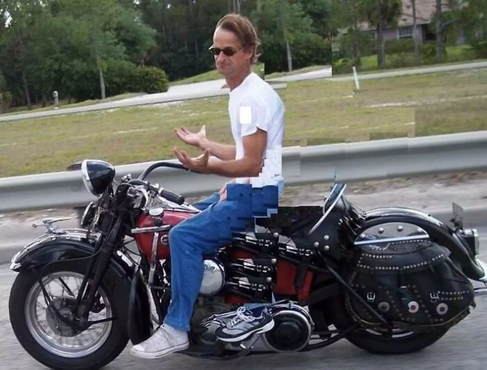 Мужчина удалил с фото свою бывшую жену, сидящую сзади него на мотоцикле. Теперь с ним катается лишняя нога.
