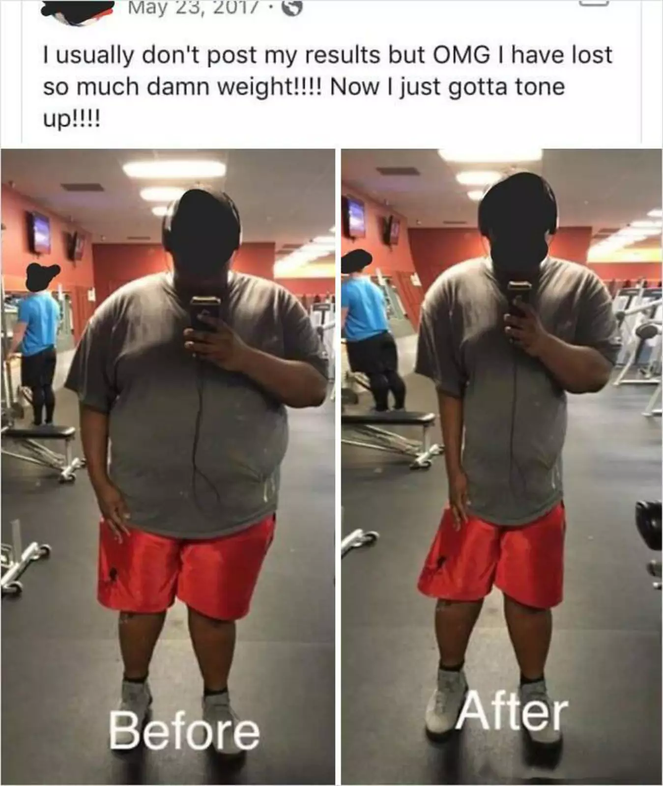 Парень в описании к фото очень гордится тем, что сбросил так много веса. Видимо, вес перешел парню на заднем плане.