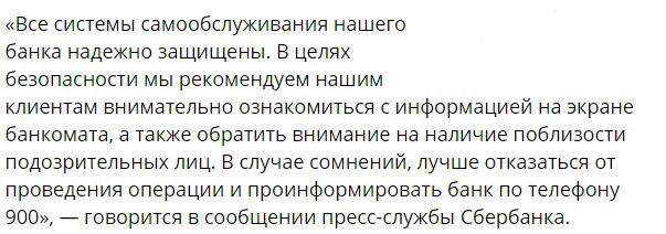 В свою очередь пресс-служба Сбербанка заявила, что системы кредитной организации защищены. В то же время в банке посоветовали клиентам внимательно ознакомиться с информацией на экране терминала.